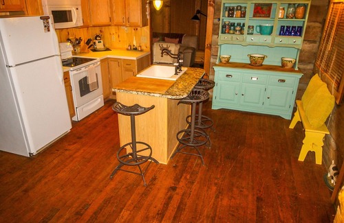 From the moment you step into “Creekside Comfort” you are sure to feel at home. A warm and inviting kitchen/dining area greets you. Featuring a gas log fireplace, a dining table for four with lazy susan, and even a Keurig coffeemaker, the kitchen is well-equipped for preparing a quick snack or even a full meal. There are tractor seat stools around the kitchen island, so the whole family can hang out together while the meal is being cooked.