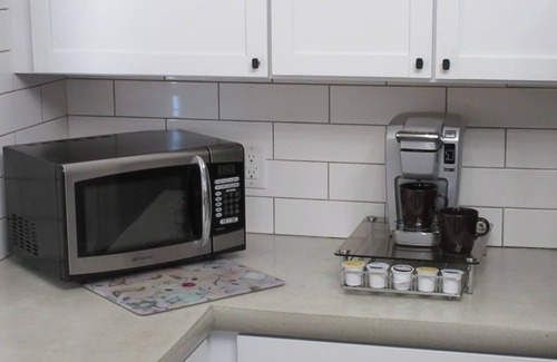 We feature an updated kitchen with full size range, refrigerator, and microwave (sorry, no room for a dishwasher). The cozy living room furniture includes a chair, futon, and dining table with seating for four. The kitchen island provides seating for an extra guest. We provide a propane grill for cooking outdoor meals or just relax in your private, fully fenced back yard and patio.