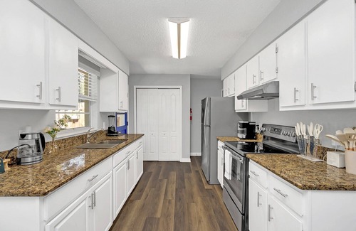 Outside, the expansive backyard is an ideal retreat for experiencing Florida’s natural beauty. Gather around the fire pit, creating a magical ambiance, or lounge under the stars while sharing stories and laughter. Thanks to its great location, you’ll have easy access to a variety of attractions for daytime adventures. Afterward, fire up the grill, relax in the backyard, and create unforgettable memories!