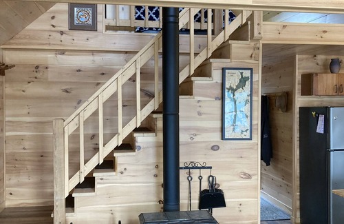 Newly built cabin. Steps to the water. Fish from the front deck! Enjoy brilliant sunsets and cocktails/coffee from the cabin deck. Common waterfront/beach with stone jetty and swim float. Kayaks included, launch from front lawn. Outside fire pit. Cozy interior with Maine Woods feel. Gas log stove for chilly evenings. Reading nook with the sounds of the water and the loons steps away. Excellent area for mountain sport and lake activities. Two bedrooms with queen-sized beds. Second bedroom is open loft style/cathedral ceiling overlooking the lake. 5 night minimum July and August. Two night minimum rest of the year.