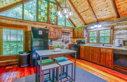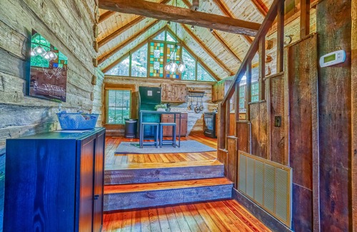 The log cabin welcomes you into a dining room, a spacious kitchen and a cozy den. The master bedroom with king bed and the bathroom are also on main level. The loft contains a reading nook and 2 large bedrooms. Both of the upstairs bedrooms contain a full size bed and 2 twins.