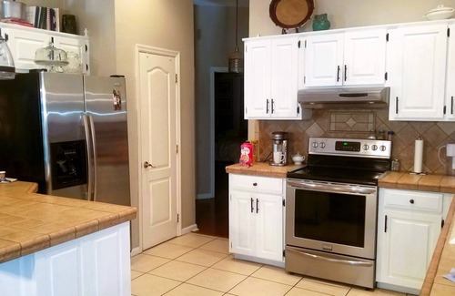 There is a master bedroom with a queen bed and a walk-in closet that provides ample storage room for luggage and to hang your items. The master has a private bathroom with a walk-in shower. The second bedroom has a full-size bed with dressers for storage and the third bedroom has a queen-size bed with dressers for storage. The soft, inviting beds have fresh new linens on them. The guest bathroom has a tub/shower combo. Provided for your convenience are clean towels, washcloths and complimentary travel size shampoo, conditioner, toothbrushes, toothpaste and soap.