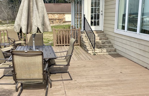 Home is a ranch style with sunroom/dining room with sweeping views of the lake. Master bedroom has king size bed with walk out doors to deck with beautiful views of the water. The other two bedrooms are furnished with four twin beds and a trundle. There is a second bathroom located in the hallway. * Notice Travelers agrees to hold harmless the owner of the property for injury, death, or loss of personal property during stay. *