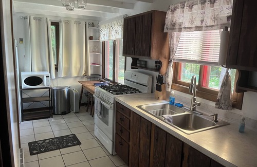 The kitchen is fully equipped for preparing meals and snacks. Although there is no dishwasher, there is a washer and dryer available. The house is fitted with fans and enjoys a nice breeze. Additionally, there is a screened ridge vent that remains open to let the heat escape. Closing the curtains during the warmest part of the day keeps the home comfortable since there is no air conditioning. There are areas in the house that you need to step up or step down.