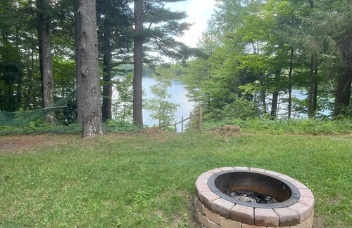 The property also includes a gas grill for barbecues, a picnic table for outdoor dining, and a fire pit for cozy evenings. A row boat and a canoe are provided for lake adventures. The lakefront has a soft sandy bottom for swimming. Younger guests will enjoy the play set in the yard.