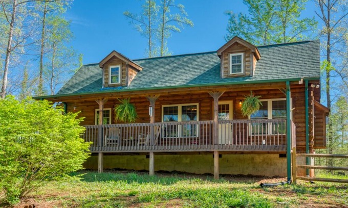 Cozy Carolina Cabin is nestled in the foothills of the Blue Ridge Mountains, NC, within easy driving distance of the Tryon Equestrian Center, a multitude of waterfalls and hiking, Lake Lure, Charlotte and Greenville. Highway access is close by. The home has a log-cabin style exterior, wide front porch with rocking chairs and swing. The front yard is securely fenced. Expansive outdoor space to enjoy the Carolina seasons. Kick back after a long day by the nicely landscapedoutdoor fire pit. Have fun making S'mores from Adirondack chairs.