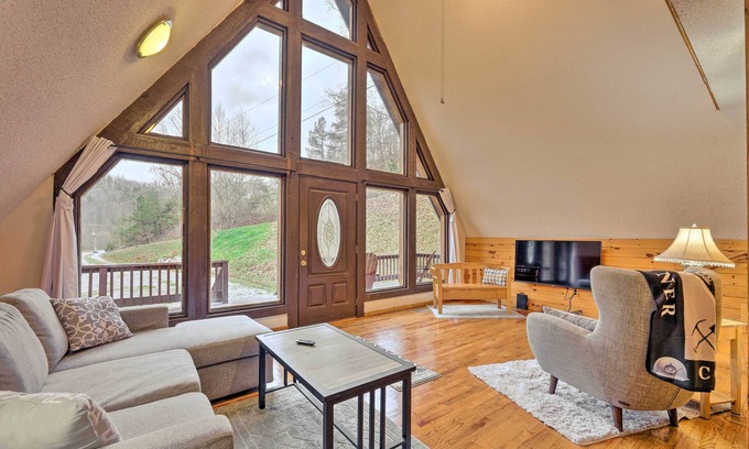Peace and mountain solitude abound at this 2-bedroom, 1-bathroom cabin. This Louisa vacation rental sits on a secluded lot within the eastern Kentucky foothills but is surrounded by tons of fun, from the twists and turns of Yatesville Lake to the scenic Eagle Ridge golf course. Enjoy your morning coffee in front of the large windowed A-frame wall before heading out for a beach day at The Cove, horseback riding at Blackburn Stables, or a quick day trip up to Huntington’s museums and gardens.