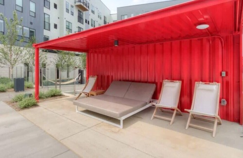 Our spacious studio apartments feature inviting living areas, fully-equipped kitchens, and bathrooms complete with toiletries. Building amenities include a pool, 24-hour fitness center, an outdoor lounge with grills and a fire pit, and a courtyard and hammock area.