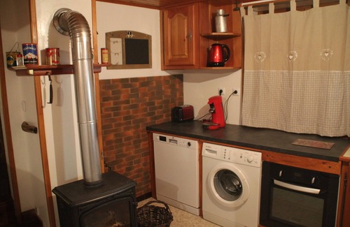 Warm apartment in a village house; upstairs apartment of 70m2 consisting of an equipped kitchen (dishwasher, electric oven, microwave, Senséo coffee maker, electric kettle, toaster, raclette and fondue machine, etc.) with a bedroom with double bed 140 / 190cm, a bedroom with bunk beds, independent living room with Rapido 140 / 200cm sofa (TV, DVD player, board games) dining room, bathroom with shower (hairdryer), separate wc. Wood stove; Bed linen not provided. Household at your expense.
