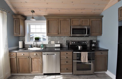 The kitchen is fully equipped with everything you need to enjoy meals together. There are two cozy bedrooms each with queen sized beds and cottage like charm. Each room provided with extra blankets and pillows to make you comfy while you drift off to sleep listening to the hum of the ocean. The main bathroom is conveniently close to the master bedroom and has a spa like feel, complete with a river rock flooring in the shower to massage those tired feet. Additional bathroom is located downstairs with easy access from outside to wash off sand after a day on the beach.