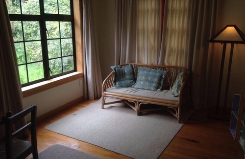 The house is owner-built on four levels to reduce impact on the site and boasts a solid wood kitchen and 2 log fires for heating (one in the kitchen-dining room, one in the large living room). You can enjoy stunning views from extensive decks and indulge in the ready made library and board game selection. The house was furnished using the finest of pre-loved items to reduce our environmental impact. (Check out the Crown Lynn and Temuka collection!). Firewood is supplied and you are asked to replace what you use from the woodshed.