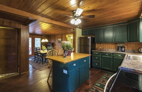 The new kitchen features stainless steel appliances including a dishwasher, full sized refrigerator, smooth top oven, built-in microwave, and Cusineart coffee maker. A butcher block kitchen island seats 2 for informal dining, while the adjoining dining area with handmade rustic lighting fixtures seats 6. The dining area has french doors which open up to a covered porch and outdoor eating area, providing a continuous indoor/outdoor seasonal living/dining area.