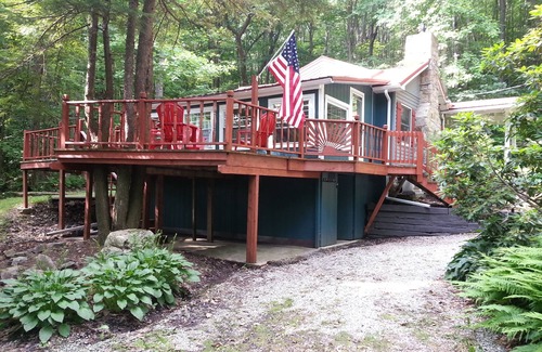Sited high on a wooded cliff overlooking the valley below with a beautiful trout stream, this cottage is located in the heart of the Laurel Highlands, just minutes to Vail's Seven Springs and Hidden Valley Resorts; Walk to restaurant or cross country ski to neighboring State Park. Short scenic drive to Fallingwater and Rafting at Ohiopyle.