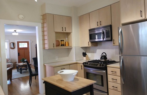 A beautiful covered front porch welcomes your arrival, especially for its perfect warm southern exposure and maximum light. The open design living area with a gas-burned fireplace is ideal for relaxation and entertaining. Two large bedrooms are on the main floor with a large full bath. Upstairs is a third bedroom with large sitting area, writing desk, children's play area with toys and books, and a 55" HDTV (a second smart flatscreen is on the main floor) with wifi TV streaming including Netflix and DVD player. All bedrooms feature queen-size beds and upstairs bedroom features futon sofa and child mattress. Separate laundry area in basement, shared with studio cottage and basement units (booked separately). Also, features covered front and back porches (off entry and kitchen).