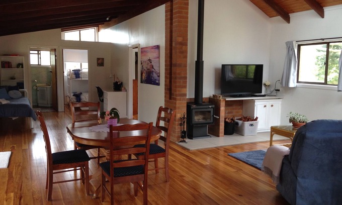 The property is situated on almost 2 acres. It has 1 acre of gardens and lawn at the front that guests can access. We have two miniature goats, a few chickens, some ducks at times, a dog -Lily, and a Guinea pig that gives some extra interest to the property. The gardens are being developed and are enthusiastically enjoyed by visitors. It is a peaceful country setting with several different areas around the property where you can stop and relax.