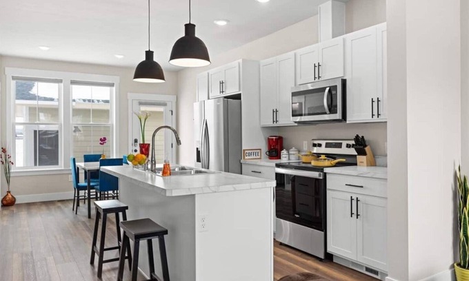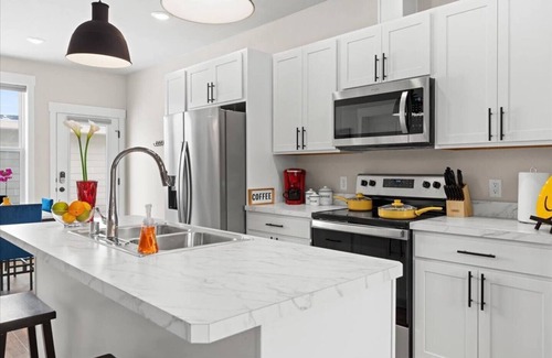 Fresh, crisp new townhome w/ modern touches. Large windows spill in lots of natural light illuminating the colorful & tastefully decorated space w/ large canvas art of a Yellowstone Park theme throughout. The living room has 65" Roku TV. The King Suite has a walk-in closet, attached bathroom, a workspace & 55" smart TV. The Bunkbed room has attached bathroom & 55" smart TV. There is a washer/dryer & all the essentials. 10 mins to downtown, 15 mins to airport, 5 mins to shops/restaurants.