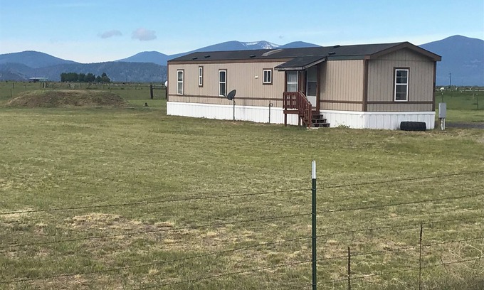 3 Bedroom , 2 full bath manufactured home on 75 acre cattle ranch. 360 degree view of the Cascade mountains, Mount McLaughlin, Chiloquin Ridge, and Mount Scott in Crater Lake National Park. Very peaceful. This home is 1/2 mile off highway 97 and about 15 miles from Crater Lake National Park south entrance. The home has a very big front lawn for games or just sitting out taking in the views and watching the cows. Tons of stars at night with some great views of the Milky Way. There are hiking trails nearby, bird watching right out the window or at Klamath and Agency lakes. Also the Klamath National Wildlife Refuge is close by.