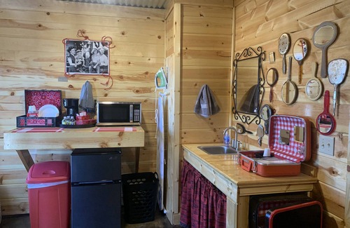 This cozy cabin comfortably accommodates two guests, featuring a plush king bed, inviting loveseat, and a spacious bathroom complete with a large walk-in tiled shower. The thoughtful design includes knotty pine finishes, dark stained concrete floors, and rustic tin accents that create an elegant atmosphere. Enjoy the convenience of a kitchenette equipped with essential appliances, as well as complimentary Wi-Fi and Netflix to unwind after a day of festivities. Spend your evenings on the long covered porch, sipping drinks while enveloped by stunning Southwest Oklahoma sunsets, or gather around the fire pit to make lasting memories with your loved ones.