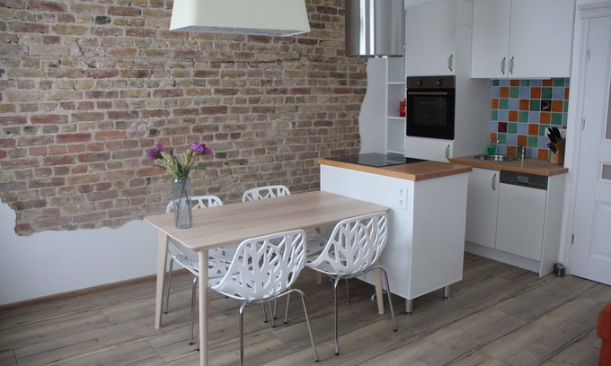 Our apartment is located in the southeast of Berlin. The fully equipped apartment is new and modern in the industry factual style. It is located in the mezzanine of a 130 year old house. The kitchen invites alike to relax, rest and cooking. The free-standing cooking island undergoes the constant contact with his fellow man cooking a pleasure. The kitchen is equipped with an induction cooker, a quiet hood with exhaust air into the open air, an oven, dishwasher, fridge freezer and everything you need for fun-prepare meals and a beautifully set table. The bathroom with window has toilet and bidet, a floor-level shower and a washing machine. In the quiet bedroom overlooking the green garden you will find a large bed and a wardrobe.