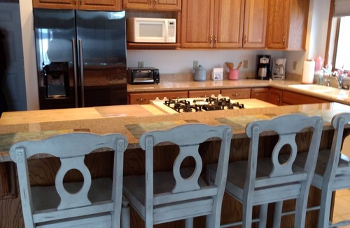 Additional deep cleaning after each guest including all handles and door knobs. Dates fill up fast so reserve your dates now! Fishermen and ladies, you'll love the variety and if you want a challenge to catch a Muskie. There are a few guides that will take you on a great charter. Duck hunters, you'll be amazed at the variety at the lake. Calendar open for up to 18 months in advance so plenty of room to book ahead. You will love this spacious home, deck and yard on 110 feet of private lakefront views from almost every room. It's the perfect place to relax and enjoy the tranquility and privacy looking over our quiet waterfront. Enjoy the tasteful furnishings with a flair from Nantucket. The Kitchen area is huge and beautiful with huge windows facing the lake. The kitchen is fully equipped with a gas convection oven/stove, microwave, dishwasher and bar that seats 4. We provide dishwasher detergent for your stay and dish liquid. If you like to be your own cook we provide blender, toaster oven, griddle, all dining ware, pots and pans and a few surprises for the kids if they're feeling creative. There is a dining table that seats 6 comfortably in the kitchen area and a nook with comfy wicker chairs and a fireplace. There is an additional Dining area off of the Great room that seats 8. Cross over to an expansive great room featuring a gas fireplace, windows facing the lake, a huge leather sectional that seats 8 and 2 cafe' tables for 2 each The large armoire has a smart TV, VCR, DVD and Wii station.. We have smart TV's and Roku is provided. I no longer have cable. The large dining area table off of the great room is also perfect for games and puzzles. There is a 1st floor laundry room for your use with detergent for your stay. There is also a half bath located on the first level by the laundry room. 1st Floor Master with California King and it's own door to the outside deck so you can wake up to the sun or fall asleep overlooking the lights around the lake. The master bathroom has a garden sized Jacuzzi tub and a walk in shower big enough for two next to a double vanity. There are extra air mattresses with all bedding upon request only.