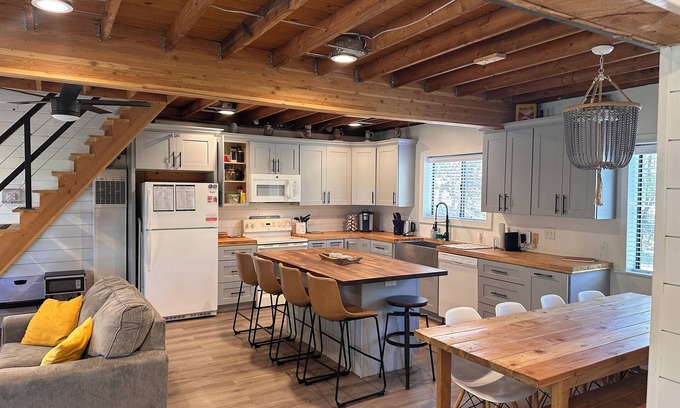 This private retreat is fully equipped to be your home away from home. The kitchen is fully stocked with all of the utensils you will need, including a Keurig. For the coffee connoisseur you will find a French press and pour-over. Enjoy your meals together around a large kitchen island (seats 4), a dining table (seats 8), and patio seating (seats 8).