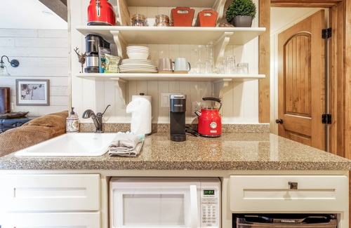 Kitchenette. It is equipped for light meals. It has a sink, a small refrigerator, drip coffee maker, electric tea kettle, Keurig and a microwave. It's stocked with dishes, glasses, and cutlery.