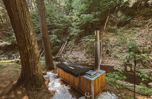 Outside, our wood-fired hot tub is a show-stopper. Located right next to the creek, it`s where you can come to relax and soak away the day. You can also hang out in the hammock and listen to the sounds of the creek.
