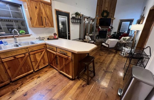Why stay in the city when you can get off the grid and still easily access the city in 15 minutes, and beautiful Paul b. Johnson Lake? Relax with the whole family at this peaceful, creek-side getaway! Cozy and rustic, cathedral living room ceiling, amazing wood-burning fireplace inside and firepit outside, all overlooking the water! Large upstairs deck & great lower covered activity space for hot days. There's a smart TV in each bedroom, a living room smart TV, outdoor smart TV and outdoor furniture set, all with easy creek access and quiet surroundings! Two bedrooms with queen beds, a pull-out couch with queen bed, washer and dryer, stove, refrigerator, microwave. You have Wi-Fi, board games, foosball, darts, polaroid camera, popcorn, snacks and coffee, and a very responsive host. Firewood provided. Everything you need to have a great getaway! There’s no one directly across the creek from the Cabin, so privacy is great from the deck & you have views of natural forest. It's a wonderful scene to either wake up to with coffee or have drinks in the evening to. Let us give you an experience worth remembering!