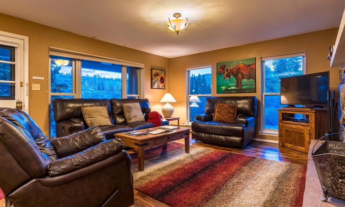 - Modern Amenities: Enjoy a fully stocked kitchen with stainless steel appliances and stylish hickory cabinetry, alongside a cozy living room featuring a large moss rock fireplace and board games for evening entertainment.