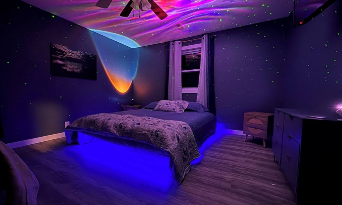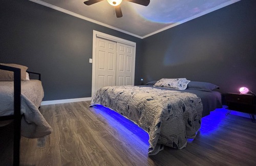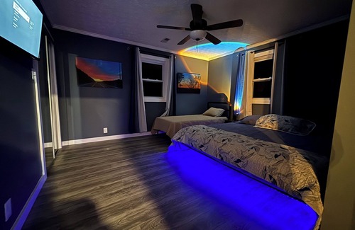 We welcome you to our cerulean creation. Our modern farmhouse will comfortably fit 10 people. All 4 bedrooms are upstairs with a King bed and twin bed in each room. Each bedroom has its own tv, closet, linens and mood lighting. There is a double vanity bathroom upstairs and downstairs. Hang out on the porch upstairs or down. There is a grill deck (propane or charcoal (bring your own charcoal)) right outside of the dining room. We are currently working on another sitting deck with gazebo down by the creek to relax and enjoy the trickling water or crackling fire pit. There should be plenty of trailer parking for multiple trailers. There is also overflow parking across the street if needed.