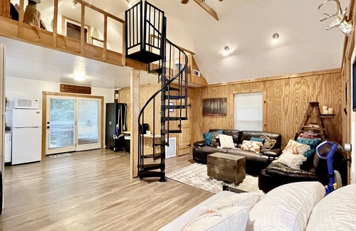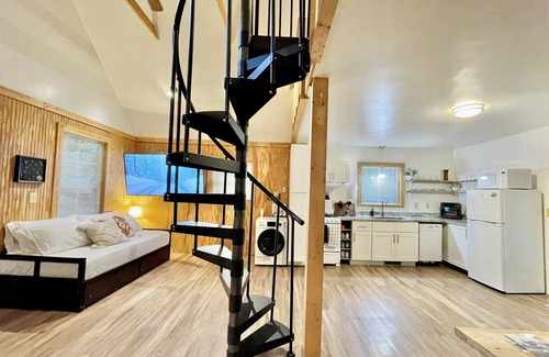 - Be aware that the bedroom is located in a loft, which is open to the rest of the home. To get to the loft, there is a very thin, spiral staircase. Although there is some railing, it is minimal and therefore inherently dangerous and difficult to navigate, especially with suitcases. Please be mindful. *The staircase is 21” wide steps, with a 300lb weight capacity* The bathroom is located on the main floor, while the bed is in the loft. If you prefer not to use the spiral staircase, the daybed in the living room also opens into a king-sized bed. *The daybed is designed more for convenience than comfort; if you are sensitive to mattresses, the daybed may not be suitable.