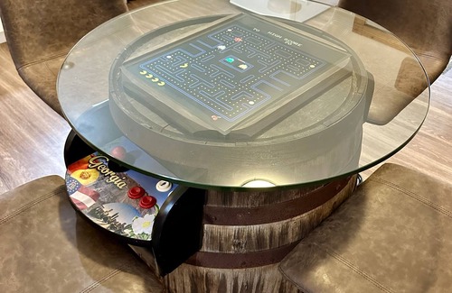 - Custom Georgia vs. South Carolina whiskey barrel with seating for 4 (can be used for gaming and dining) with classic 80’s arcade games