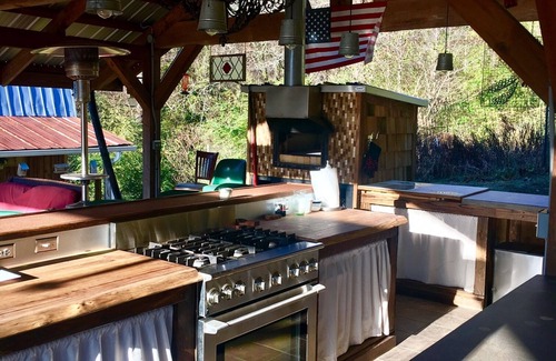 In addition to the cabin itself, guests at Creekside also have full access to some shared spaces. Just outside the cottage is a beautiful timber-frame pavilion. It's an incredible space with a full chef's kitchen, 36" gas range, 10' dining bar, 12' hand-built farm table, wood-fired oven, huge professional charcoal grill/smoker, plenty of seating, fans, chandeliers, and lots of character!