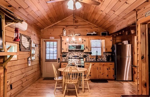 This quaint, charming mountain cabin perfectly blends a rustic wood interior with plush accommodations in an open floor plan, creating a unique escape that will surely exceed your expectations! You'll feel right at home with the chic mountain cabin decor, wireless internet, smart ROKU TV and gas fireplace for those toasty mountain days and nights. Or unplug and savor all that mother nature provides while you fish in the catch-and-release pond, just a few steps away. A fishing rod is provided!