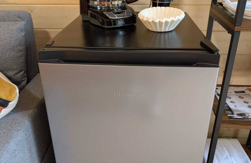 Step inside to find a warm, open space adorned with tasteful decor and thoughtful touches. A cozy queen bed promises restful nights, while a charming reading nook invites you to curl up with a good book and a fresh cup of coffee from your personal brewer. The loveseat folds out for a functional twin bed (could sleep two small children). The well-equipped kitchenette features a fridge/freezer combo—perfect for stocking up on local goodies—and there’s ample room to unpack and settle into your new favorite retreat.