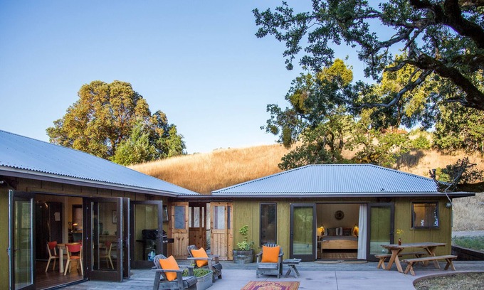 The Creekside Cottage is serene and secluded, adjacent to a creek. There are two sides of the cottage connected by a breezeway, and both sides of the cottage open through french doors to a large private patio next to an expansive meadow, surrounded by oaks and old-growth madrone trees. Many miles of private trails extend right from the cottage doorway.