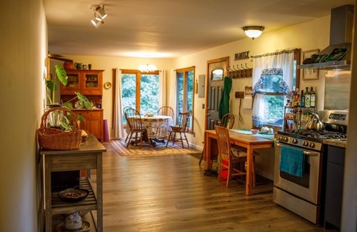 The property is pet-friendly, allowing a maximum of two dogs weighing up to 40 lbs each. While the indoor wood-burning stove is not available for use, a Daikin ductless AC and heater, controlled by remote, ensures comfort year-round. Bedrooms are equipped with plug-in electric heaters for additional warmth. There is no dishwasher.