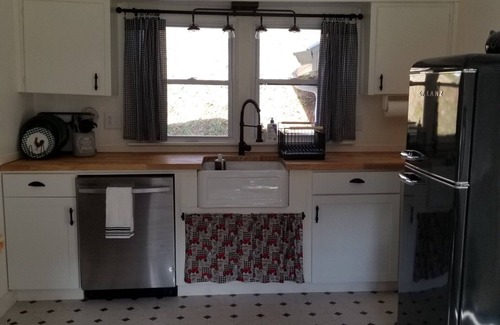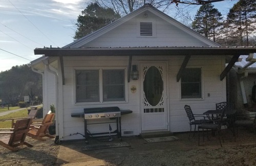 Whether you are looking for a cozy cottage to unwind after an adventurous day outdoors or peaceful privacy and relaxation, Coon Creek Cottage is perfect for you! Disconnect at this comfortable 2 bedroom, 1 bathroom home that comfortably sleeps four. Great for remote work with fast wifi with a dedicated workspace. This cabin is ideal for a couple's retreat, family getaway, or friends who are looking for a Smoky Mountain escape. Stay with us to experience the charm and scenery of the mountains. Our 1940s farmhouse was totally renovated last year and has a bathroom with a large rainhead shower. The kitchen was remodeled with new appliances as well as a new instant water heater and new HVAC. The farmhouse has 100-year-old recycled beams and floors. Newly remodeled 2 bedrooms with queen beds. Office with a fold-out couch. Eat-in kitchen with all new appliances. Double oven range, vintage refrigerator, dishwasher. Patio dining with outdoor grill and griddle. The gathering space features a chiminea with a pizza oven. Across the street is a two-acre play and picnic area bordered by a small creek. We also have another VRBO across the street, Coon Creek Too. VRBO#3312950. Although quiet and somewhat secluded, it is only a ten-minute drive to downtown Franklin on paved roads with easy year-round access. Minutes more to Sylva, Harrah's Cherokee Casino, and Western Carolina University. Pets are welcome when our $75 per visit Pet Fee is added when you specify a pet