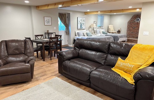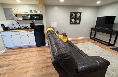 Stay at our retreat at Mill Creek Suite. Our Suite offers an open floor plan with room for up to 6 guests with two queen size beds (2 single air mattresses available upon request), with a new kitchenette ,large Master Bath. Cozy living room with a leather reclining couch and a leather reclining chair, a smart tv, netflix, eating area with table and 4 chairs, mini-fridge with freezer, microwave, Keurig coffee maker, and toaster oven. Take a walk on our trails to end or start your day. Enjoy coffe or a drink on our decks observe deer, turkey, hawks and other colorful birds.