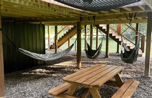 The Hammock Hangout is a relaxing spacious 3 bedroom 2.5 bath retreat located along side a slow flowing creek with the sights and sounds of a nearby waterfall. This secluded and elevated property is unique not only by it's location but with a 2 person hammock built into the wrap around porch. There is also a large 2 person soaking tub upstairs.
