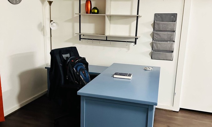 Cute and spacious one bedroom basement apartment with private entrance in a family neighborhood home. LVP floors throughout, a kitchenette with a mini-refrigerator, microwave and coffee machine (not a full kitchen) A bedroom with a queen and twin bed, and to top it all, it features a projector in the living room. A deck with a firepit table and 4 chairs with a view to a beautiful creek.