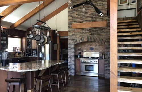 Overlooking a year 'round babbling creek, this mountain retreat will surround you in natural beauty while giving comfort, joy, and awe. Sweeping views of the hillside and creek set the mood in the great room. The wall of windows provide warm light for gathering at the dining table and lounging on the large sectional. Luxurious finishes include a chef's kitchen with corner farm-sink, granite counters, plus commercial range and hood. Details like locally harvested, reclaimed barn wood, soaring beams, and rich walnut doors & trim compliment the native setting. There’s also a wood-burning stove providing both warmth and ambiance.