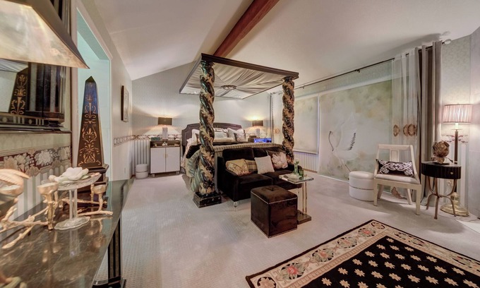 it is a Creekside Paradise.. You won't want to leave this private enclave reminiscent of wood and glass chalets along the creek in Vail. The creek runs right by the house with a little waterfall, island in the center of the creek accessed by a wood bridge. This is the mountain retreat of a renowned San Fransisco area designer. Ugraded, luxurious but cozy and warm. Two master bedrooms have private baths. Main master has romantic king canopy bed, fireplace, seating area, whirlpool tub and separate shower. 2nd master has king bed and private bath. 3rd bedroom queen.with bath steps away. 5 star ambience and comfort meticulously maintained