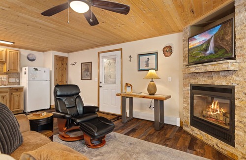 Beautiful newly remodeled Spa Suite. Offering a king bed, with an in-room jacuzzi next to picture windows that overlook scenic Fall River. Bathroom includes a walk-in shower. Kitchen has all basic cooking essentials and a small dining area. Living Room has a comfy sleeper sofa, flat screen t.v. with cable and a cozy gas fireplace. Private deck with patio furniture has gorgeous views of mountains and Fall River. Enjoy watching the wildlife stroll by your window! Free Wifi. Free fishing.
