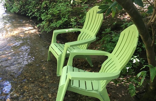 If you're looking for that private yet easily accessible cabin on a creek, this is it! It is perfectly situated above a large chattering creek that can be seen and heard while relaxing or dining on the porch. The picturesque stairway down through the tree canopy will take you to a picnic table, bench and firepit right beside the creek. Be sure to take your fishing pole because you're sure to see a rainbow trout or two on the 120 ft of shoreline right on the property. Perfect water playground for children of all ages. Inside the cabin, you’ll find a bedroom with a king bed, a bedroom with 2 twin beds and a single sleeper sofa in the living room. This offers plenty of room for 5 (or 6 if you don't mind sleeping on a couch). There are 2 full bathrooms. The living room has a roku tv and a DVD player with a large selection of DVDs. Both bedrooms have a tv and DVD player. Very good cell service over the entire property. The kitchen, dining area and living room are all openly connected so that all can be together. It's truly an amazing place!