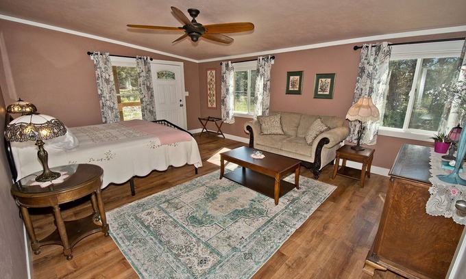 The property is home to many animals; we have sweet one dog Molly; she is not allowed inside the Suites. We also have several geese and chickens that roam the back lot. The geese and chickens, as well as the dogs, are not allowed inside the garden area.