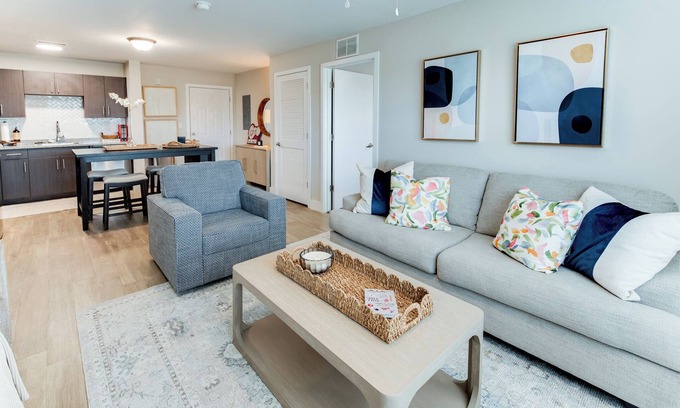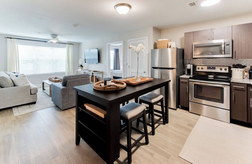 Both bedrooms are thoughtfully furnished with a king-sized bed and its own private bathroom, providing a tranquil space for rest and relaxation. The open-concept living area is designed for unwinding, with cozy seating and a flat-screen TV for your entertainment needs. The fully-equipped kitchen invites you to prepare your favorite meals, complete with modern appliances and ample counter space, and the dining area is perfect for sharing those meals together.