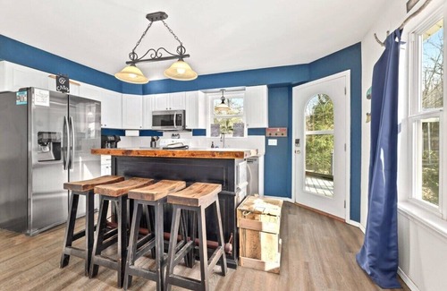 Between the living room and kitchen area, you'll find a wooden island with four barstools, a built-in wine rack and TONS of board games! In the kitchen, you'll have access to our fully stocked cabinets. Here, you'll find everything you could ever need to create your favorite meals or baked goods.