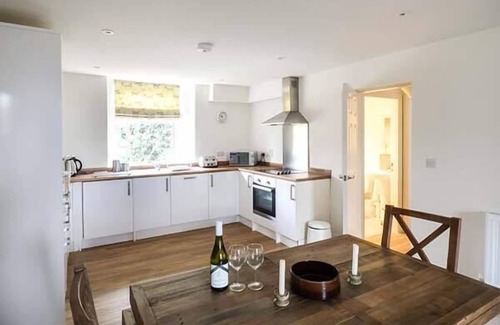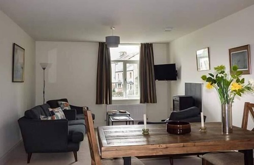 Amenities: Gas central heating with woodburning stove and gas stove. Electric oven and hob, microwave, fridge/freezer, washing machine, dishwasher, TV with Freeview, DVD, WiFi. Fuel, power and starter pack for stove inc. in rent. Bed linen and towels inc. in rent. Cot and highchair on request. Off road parking for 1 car. Secure bike storage. Shared lawned garden with patio areas. Sorry, no pets and no smoking. Shop 10 mins walk, pub 2 mins walk. Note: Access is via external covered stairwell. Note: Apartment building is set next to a river, children to be supervised at all times.