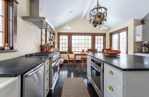 In the bright and cozy TV room is a vaulted ceiling with a skylight, large windows framed in dark wood offering picturesque views, neutral toned sofas arranged around a lucite coffee table atop a soft patterned area rug. A welcoming open-plan living and dining area offers comfortable seating by large windows, a round dining table for six and two fireplaces while the fully equipped kitchen boasts a lovely stone brick wall pizza oven, white cabinetry with brass handles, soapstone countertops and stainless steel appliances.